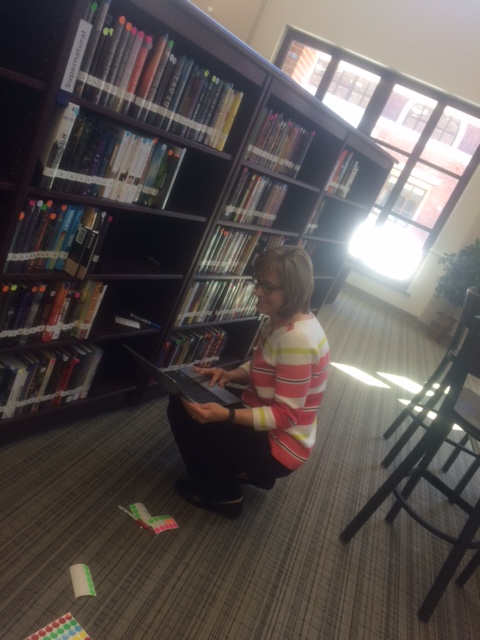 As I was working on those Mrs. Krejci, my extraordinary part-time library aide, went about putting colored dot stickers on all the books. We used A LOT of dots, and I purchased the different colors of dot stickers from Wal-Mart and Office Max.