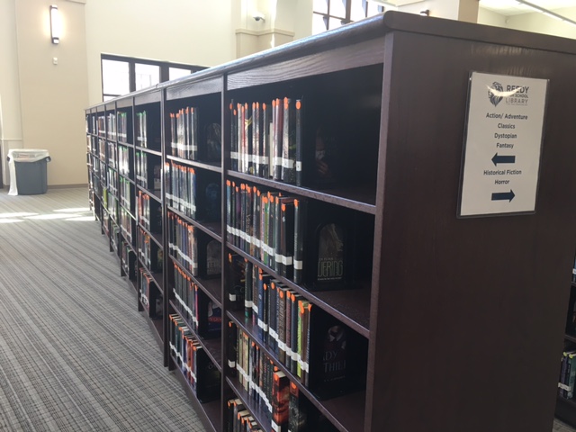 After Mrs. Krejci finished putting the stickers on all the books, we set aside one whole day where there were no classes scheduled in the library to move the books. Mrs. Krejci came up with the plan to load the first 3 genres (3 of the smaller genre groups) on carts and then start shifting the Fantasy books into their new home on the empty shelves. We started carts for the other genres as well until we got one whole row of shelves empty. Then we loaded in Action/ Adventure, Classics, Dystopian, and worked our way around to Fantasy. From there we continued pulling the next genres until we had all the books from that genre on carts, and then we would load those in. As the carts emptied we could finish clearing the shelves of the Realistic books which was the biggest section by far. We were successful in moving all the books to their new physical homes in just 1 school day! You can watch my Snapchat story of it below.