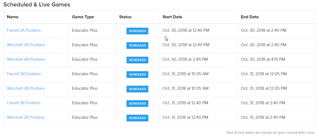 *All games are set to start at the beginning of the class and stop at the end.